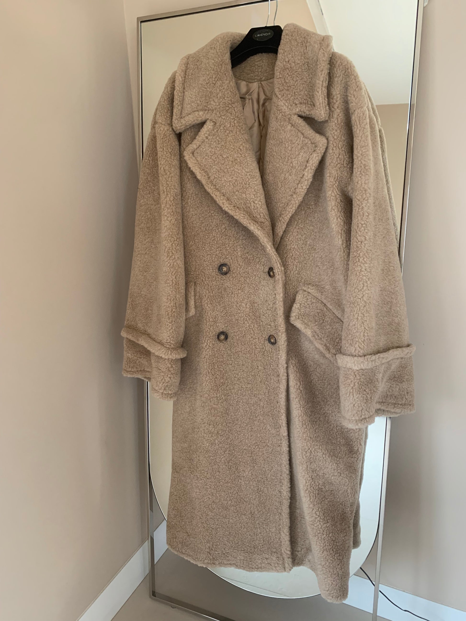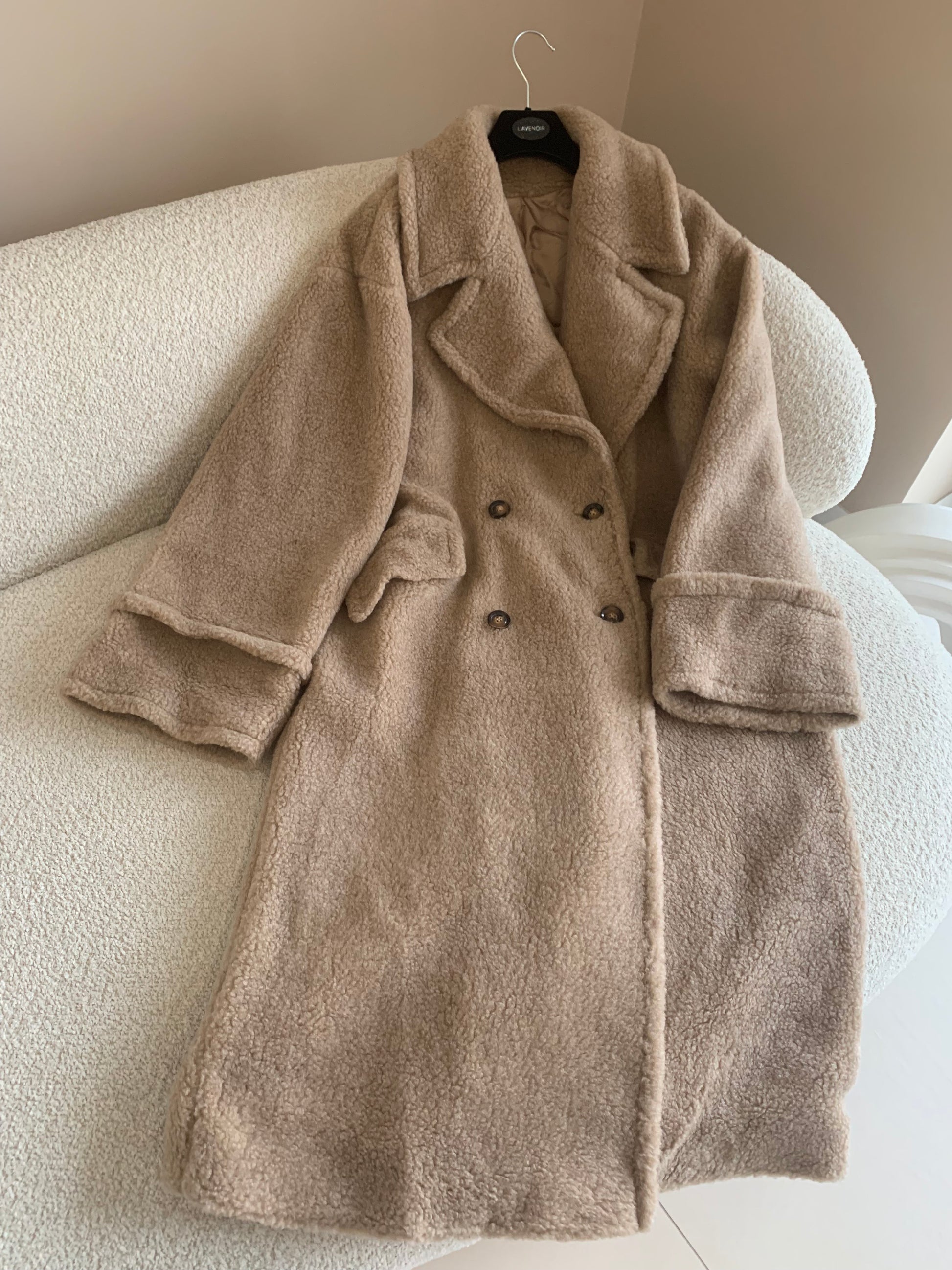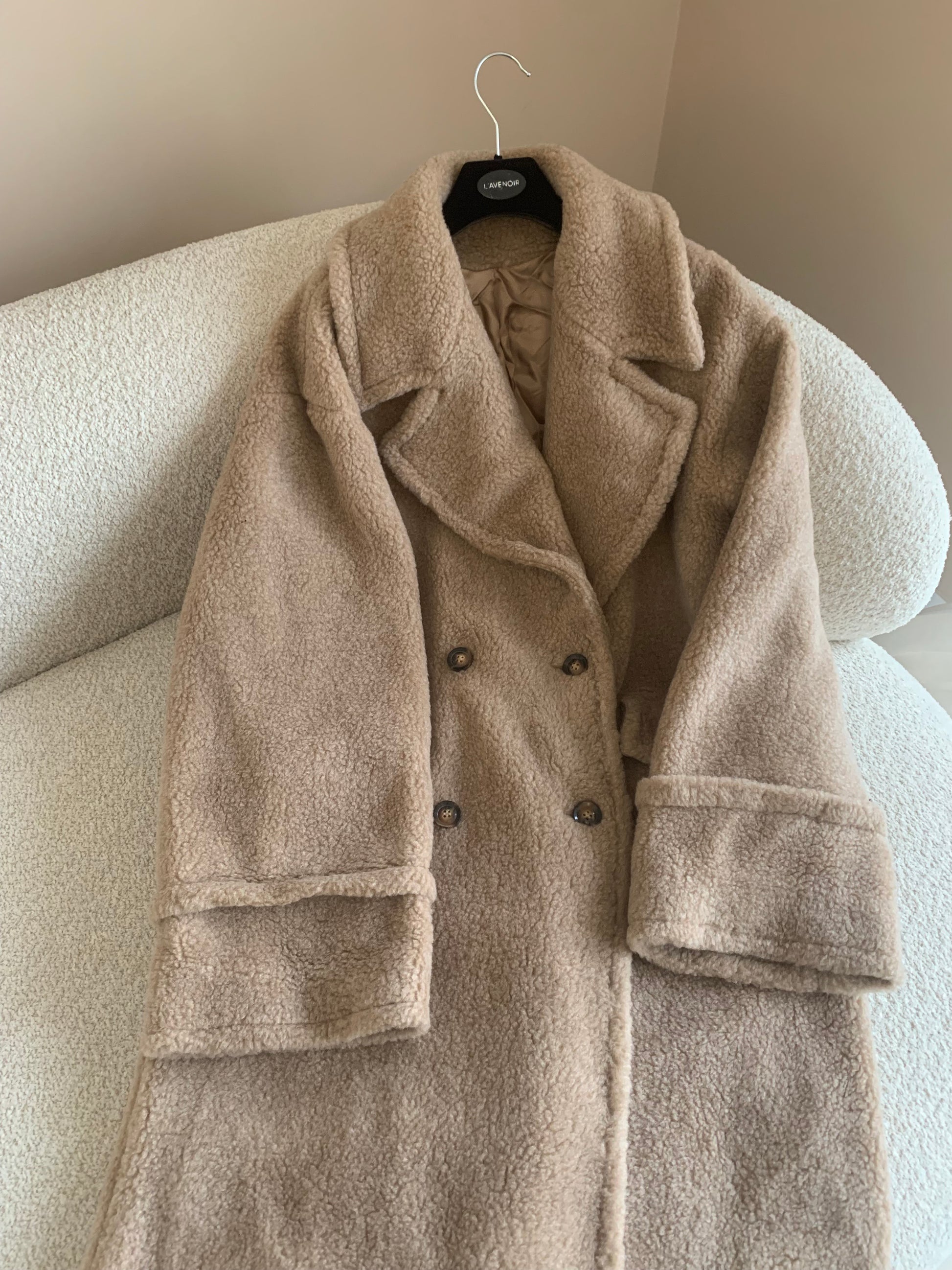Płaszcz typu baranek wykonany z najwyższej jakości wełny. Niezwykle lekkie a zarazem ciepłe. Przepiękny gatunek wełny. Klasyczny, ponadczasowy krój.