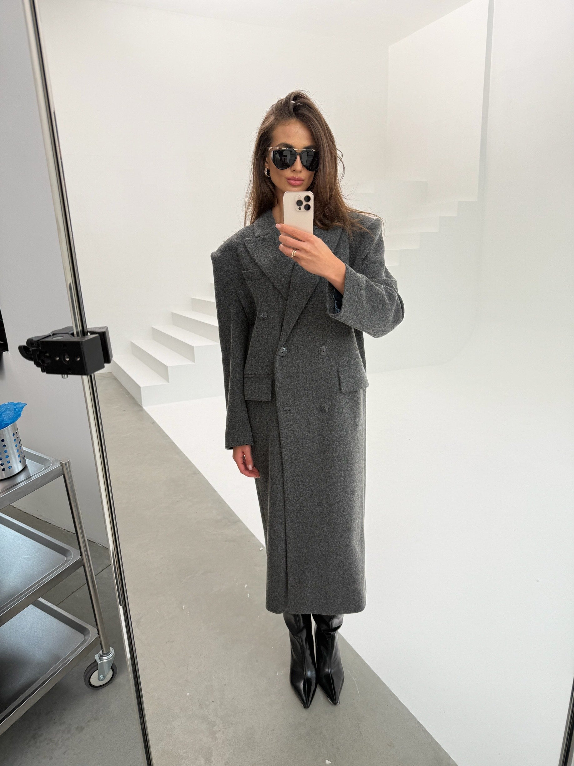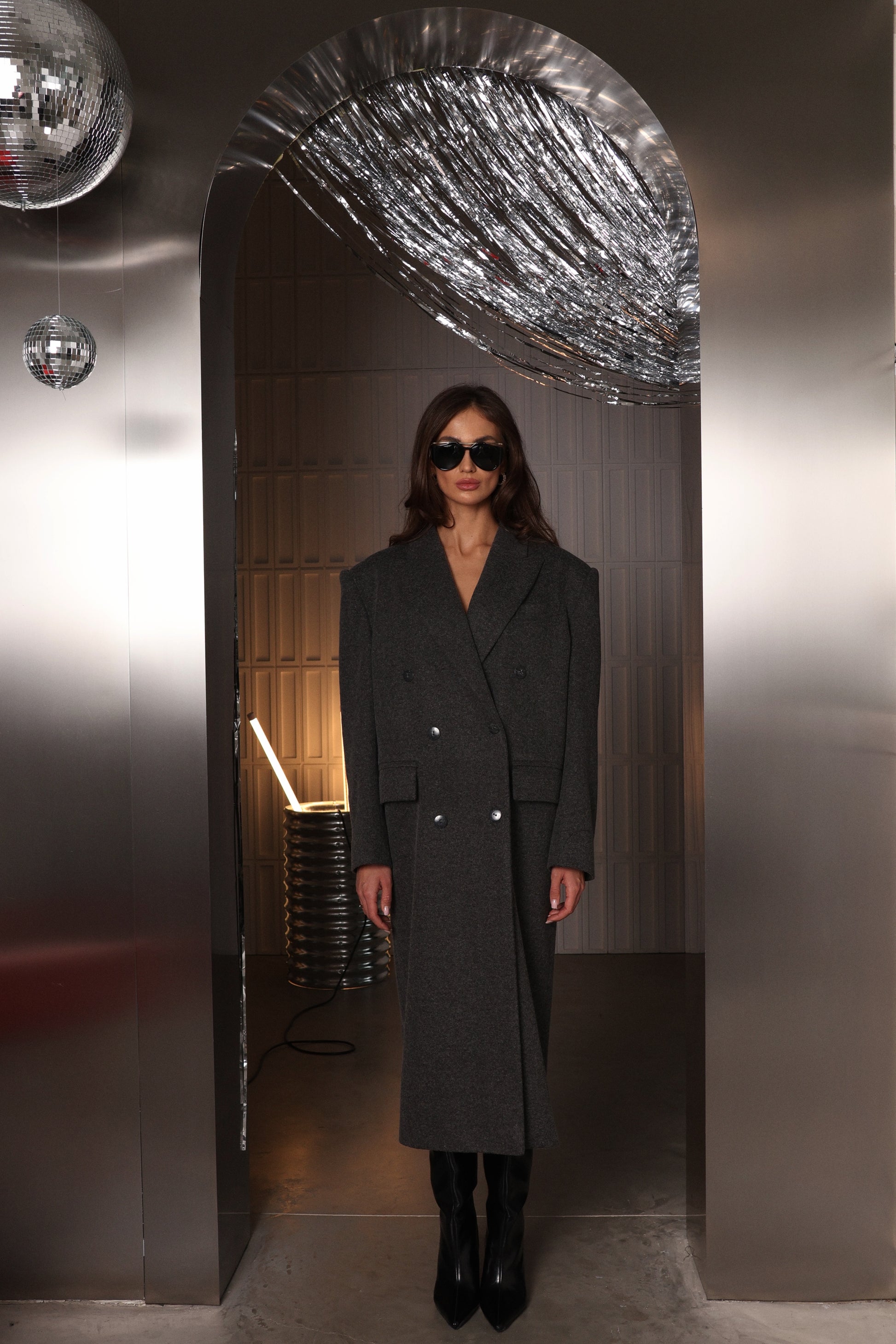 Płaszcz oversize z opuszczonymi ramionami oraz dużymi poduszkami o przerysowanym efekcie. Wykonany w 100% z wełny.
