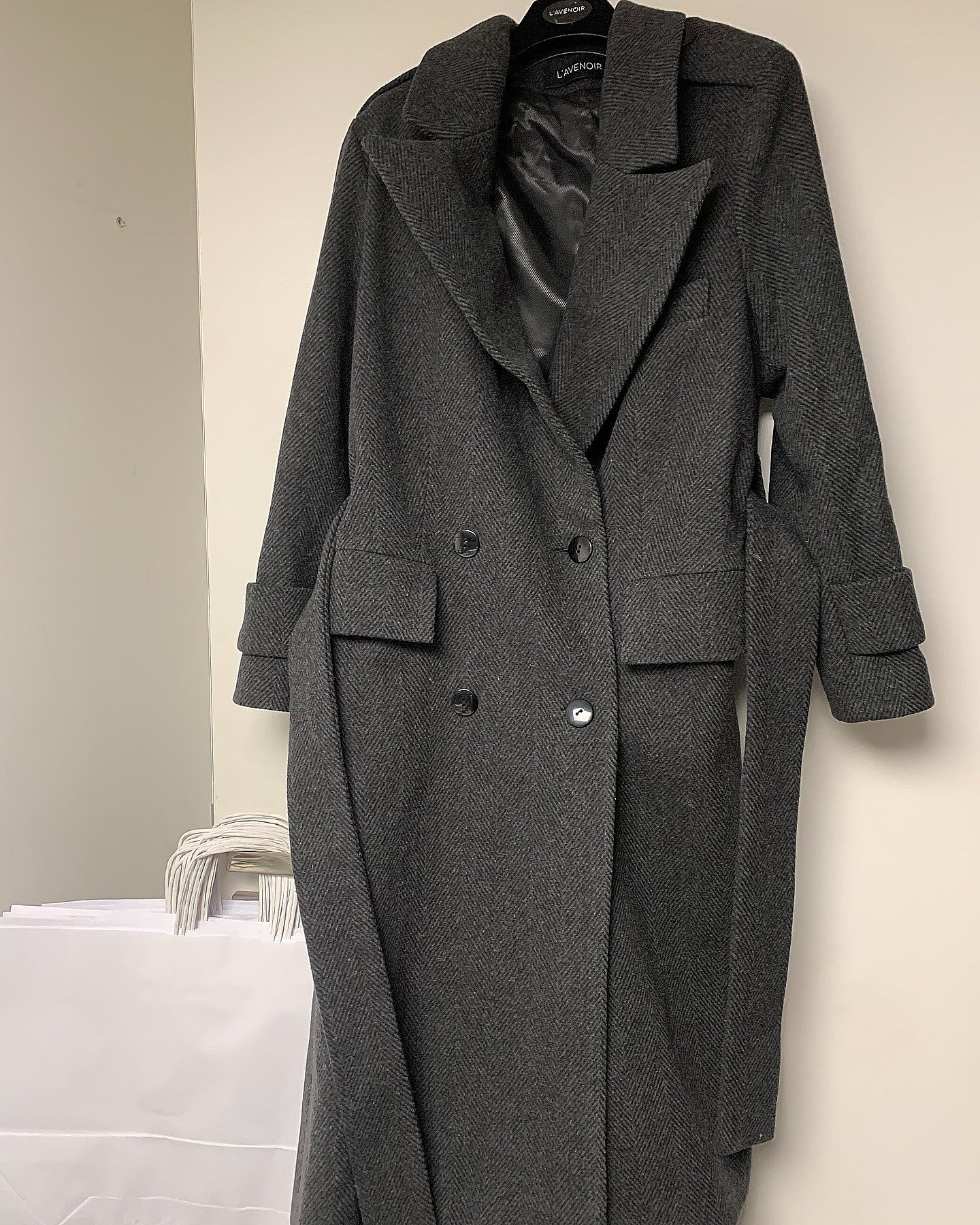 Wełniany płaszcz Carmen, wykonany z wełny w jodełke z dodatkiem kaszmiru.
