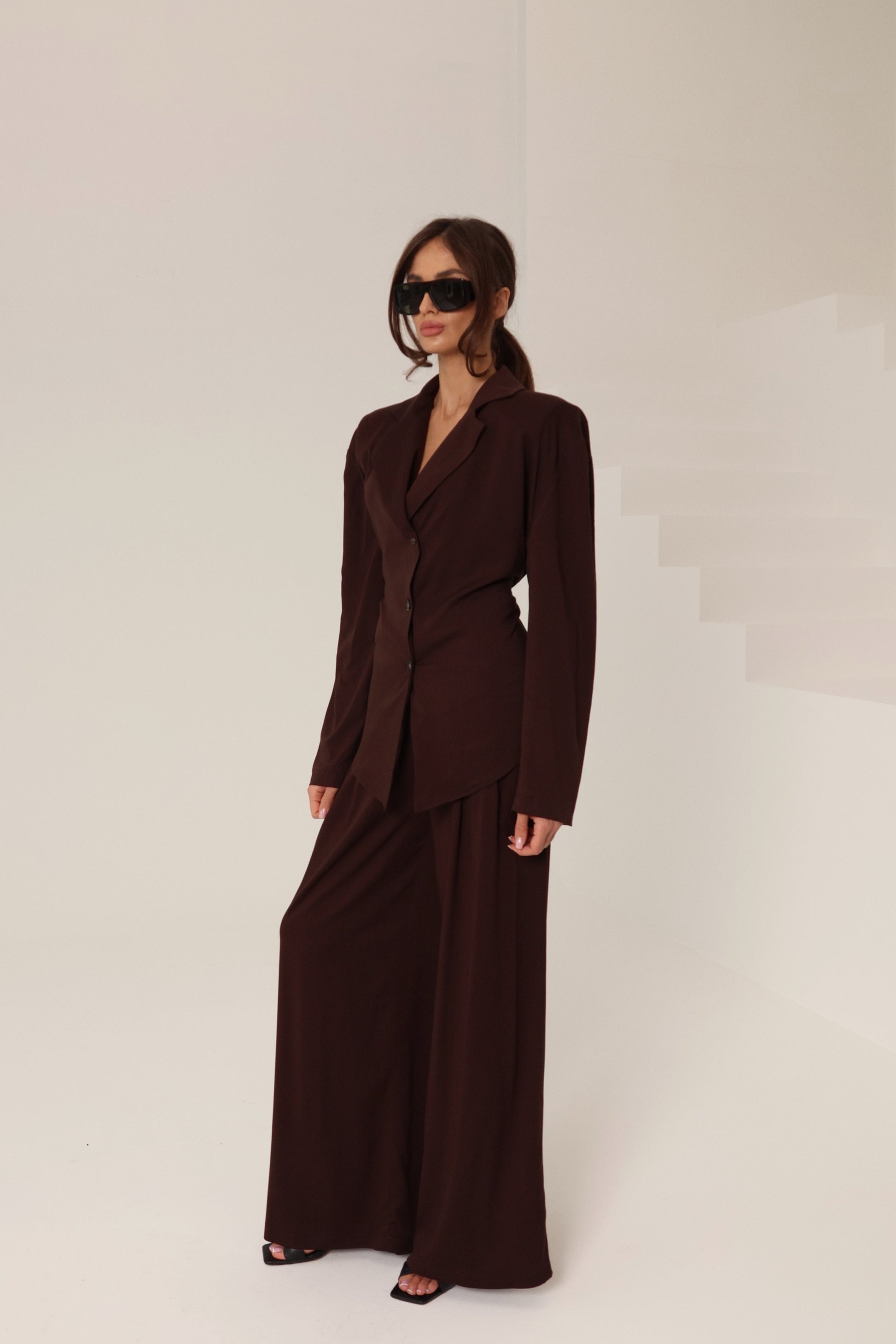 Spodnie wykonane z tkaniny wiskozowej, przemiłej w dotyku o wysokiej gramaturze, nie prześwitują. Do kompletu koszula: