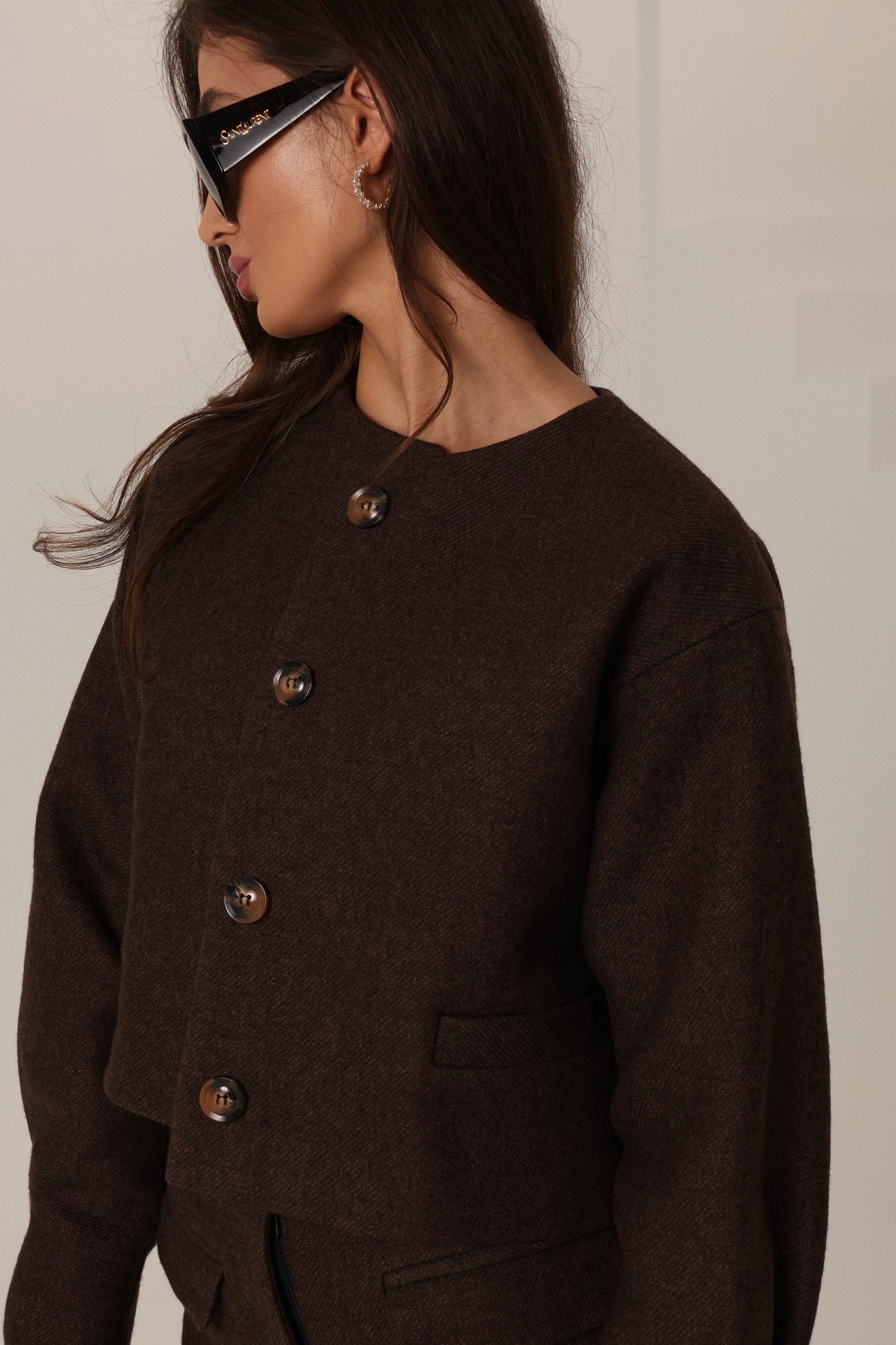 Kurtka w kolorze czekoladowym wykonana z przepięknej wełny we wzorze diagonal.