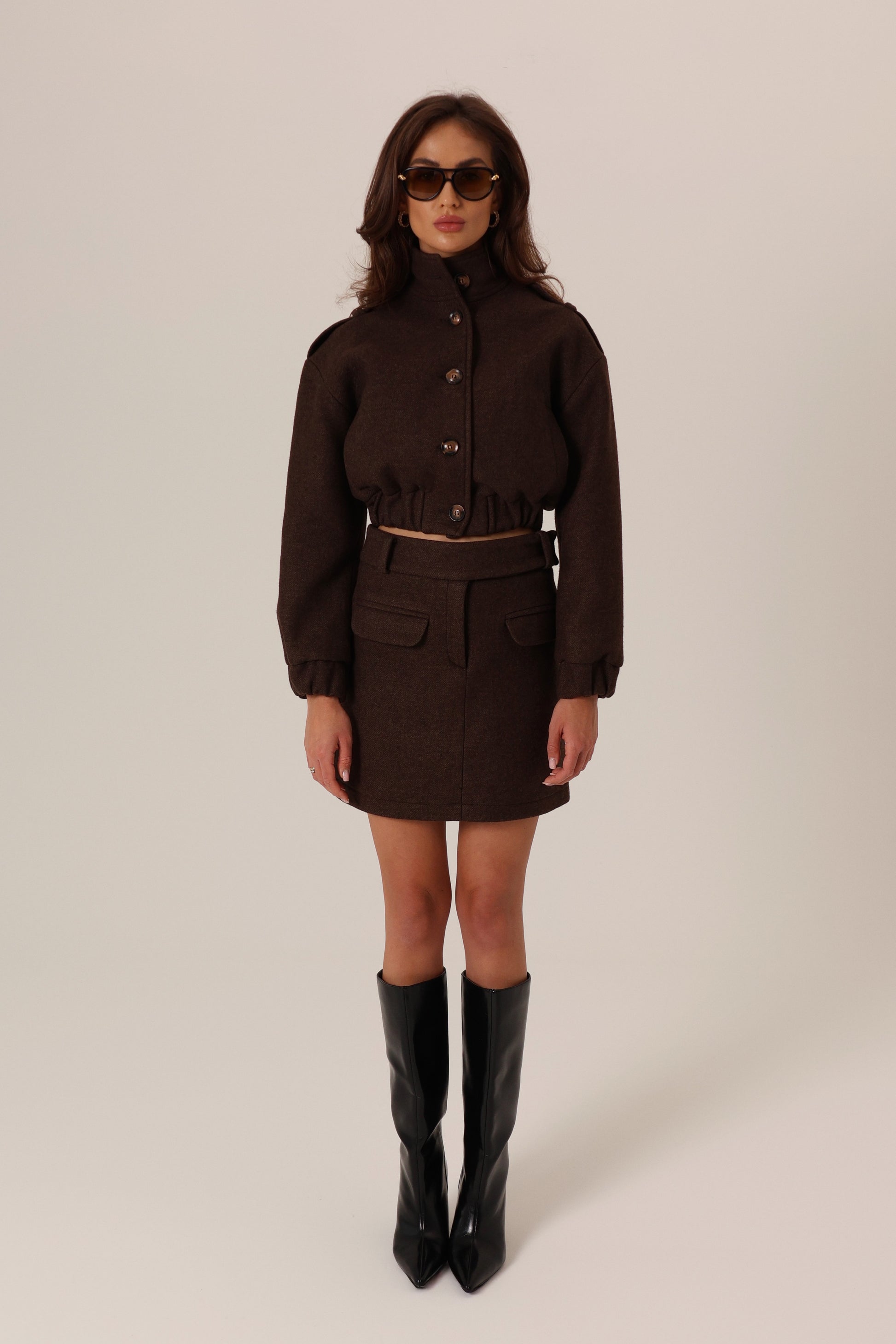 Kurtka w kolorze czekoladowym wykonana z przepięknej wełny we wzorze diagonal.