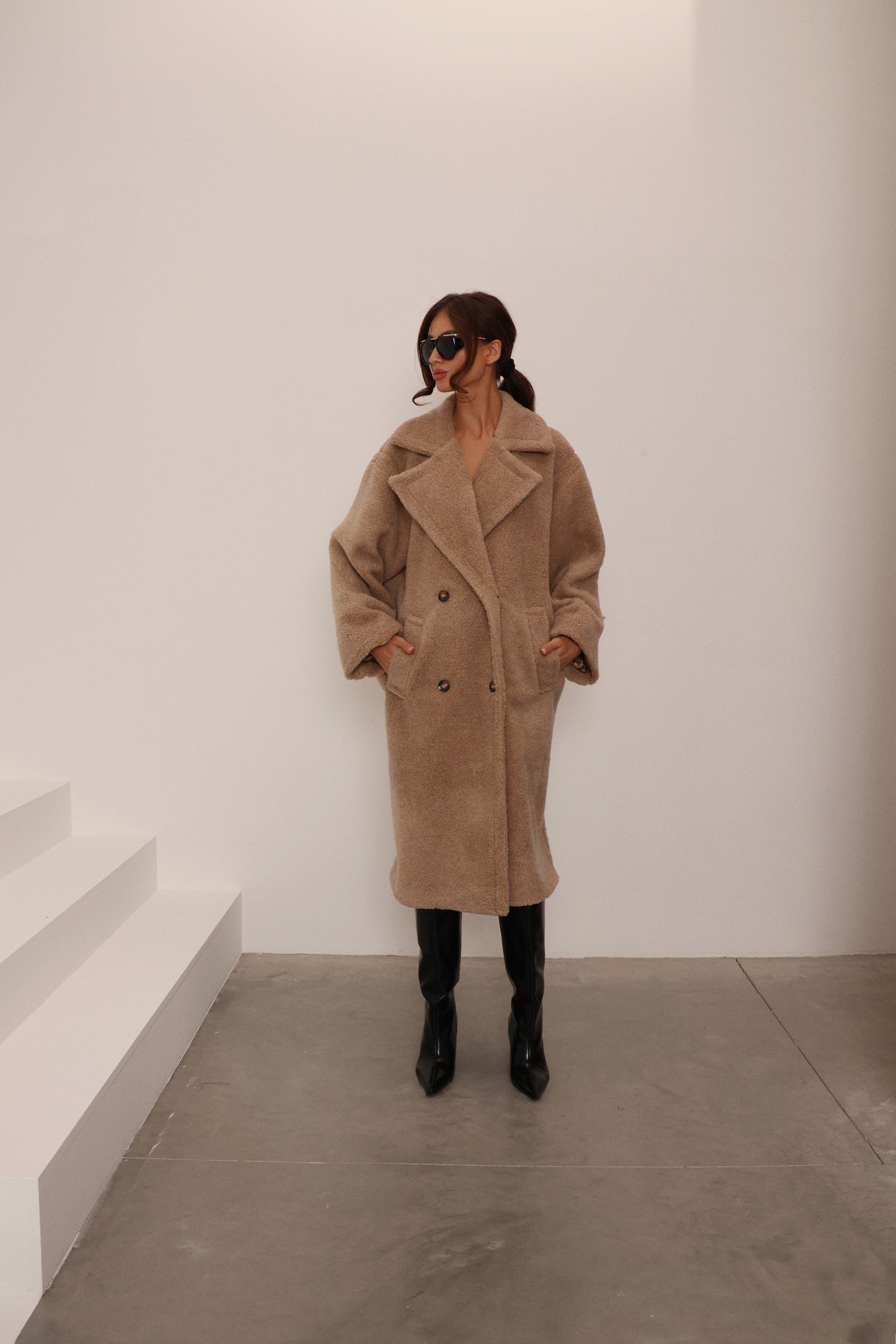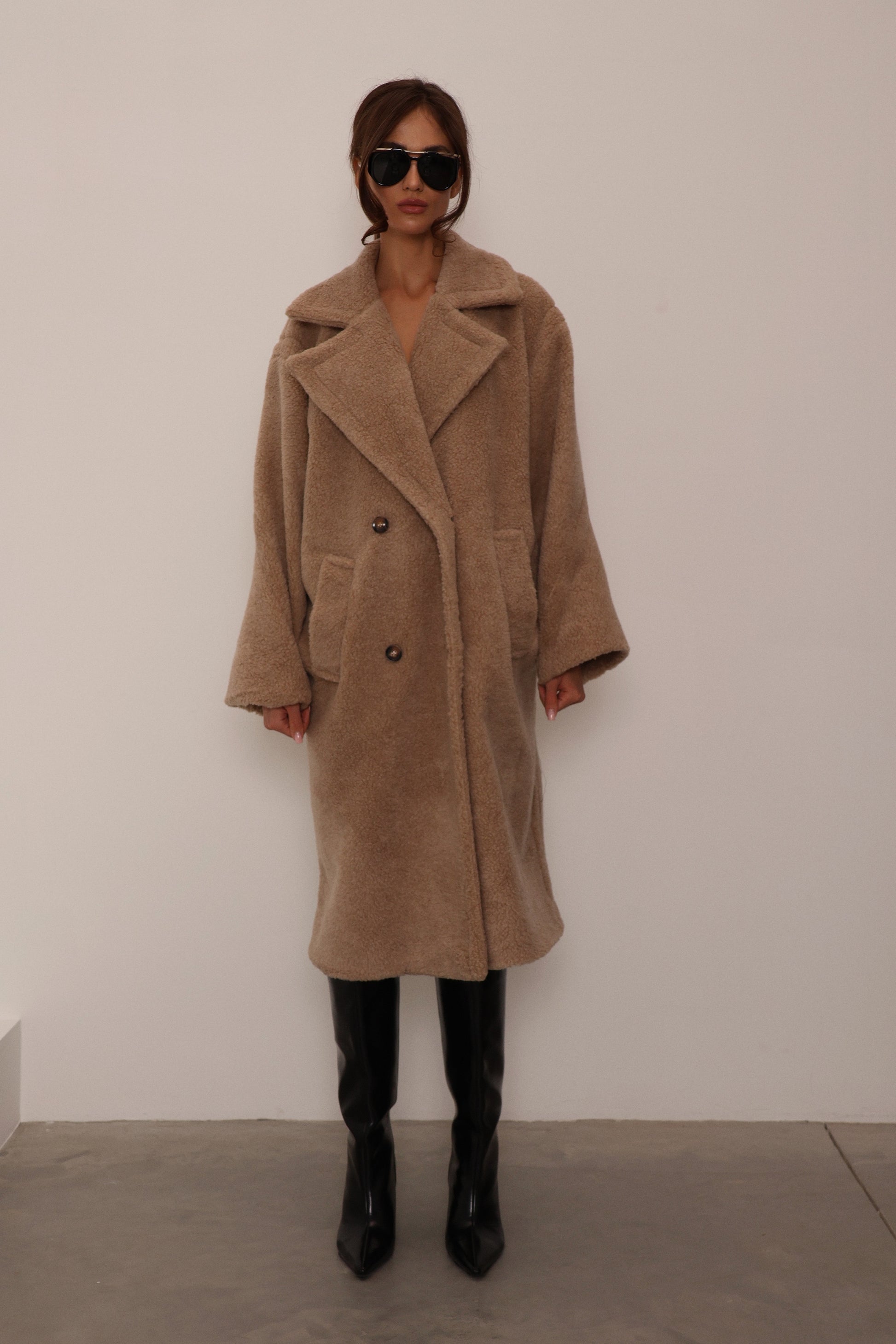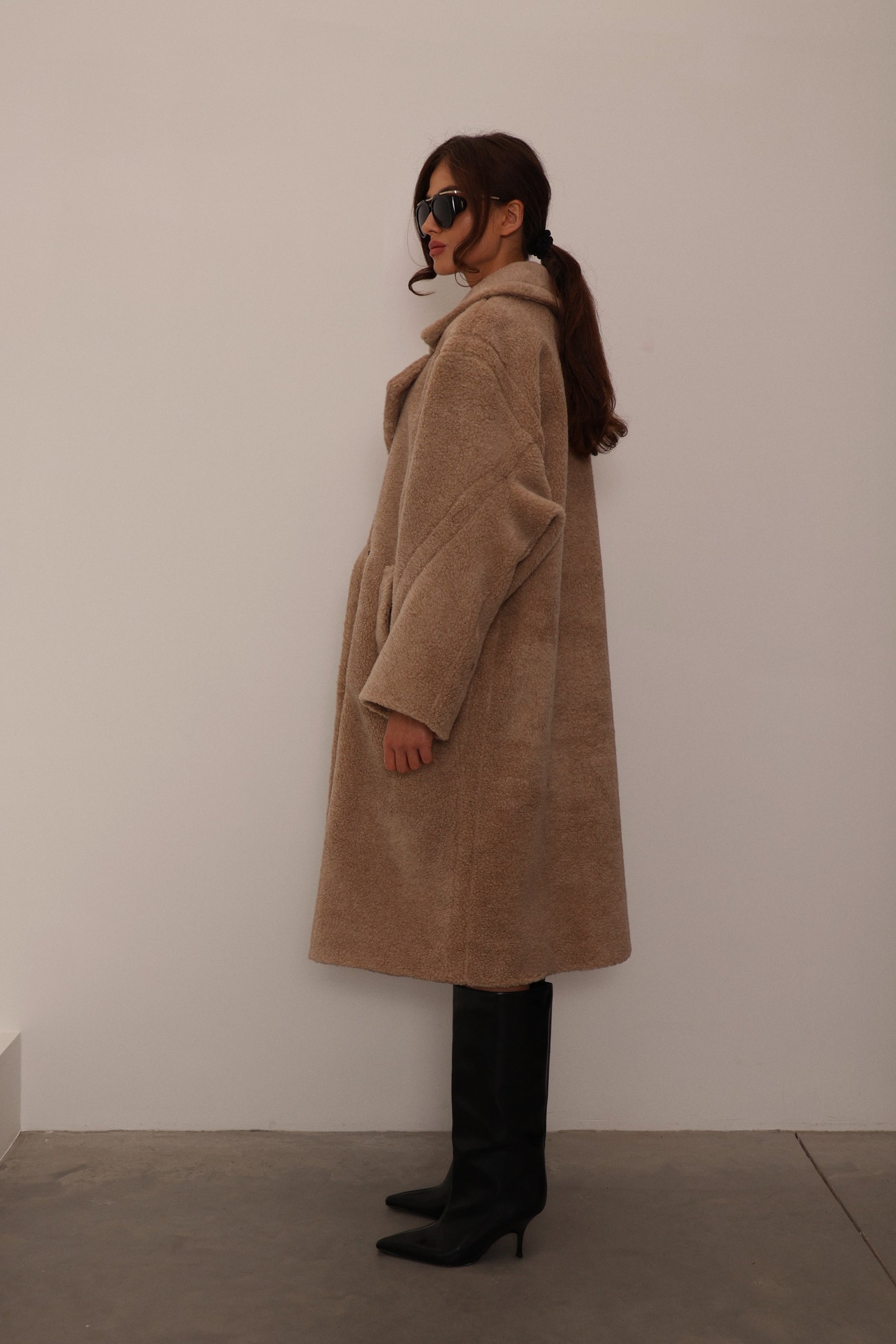 Płaszcz z limitowanej kolekcji. Bardzo ciepłe, oversizowe futro TEDDY w przepięknym beżu.