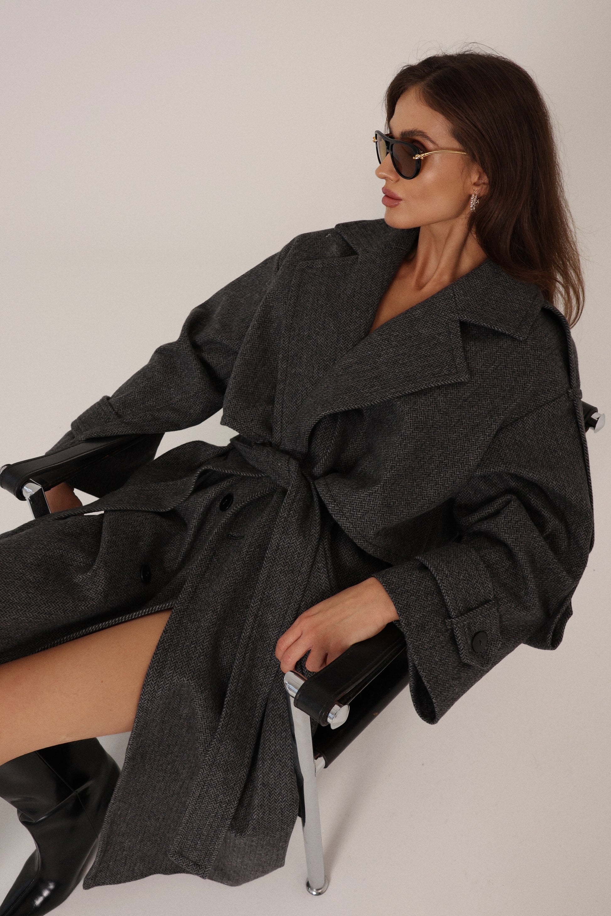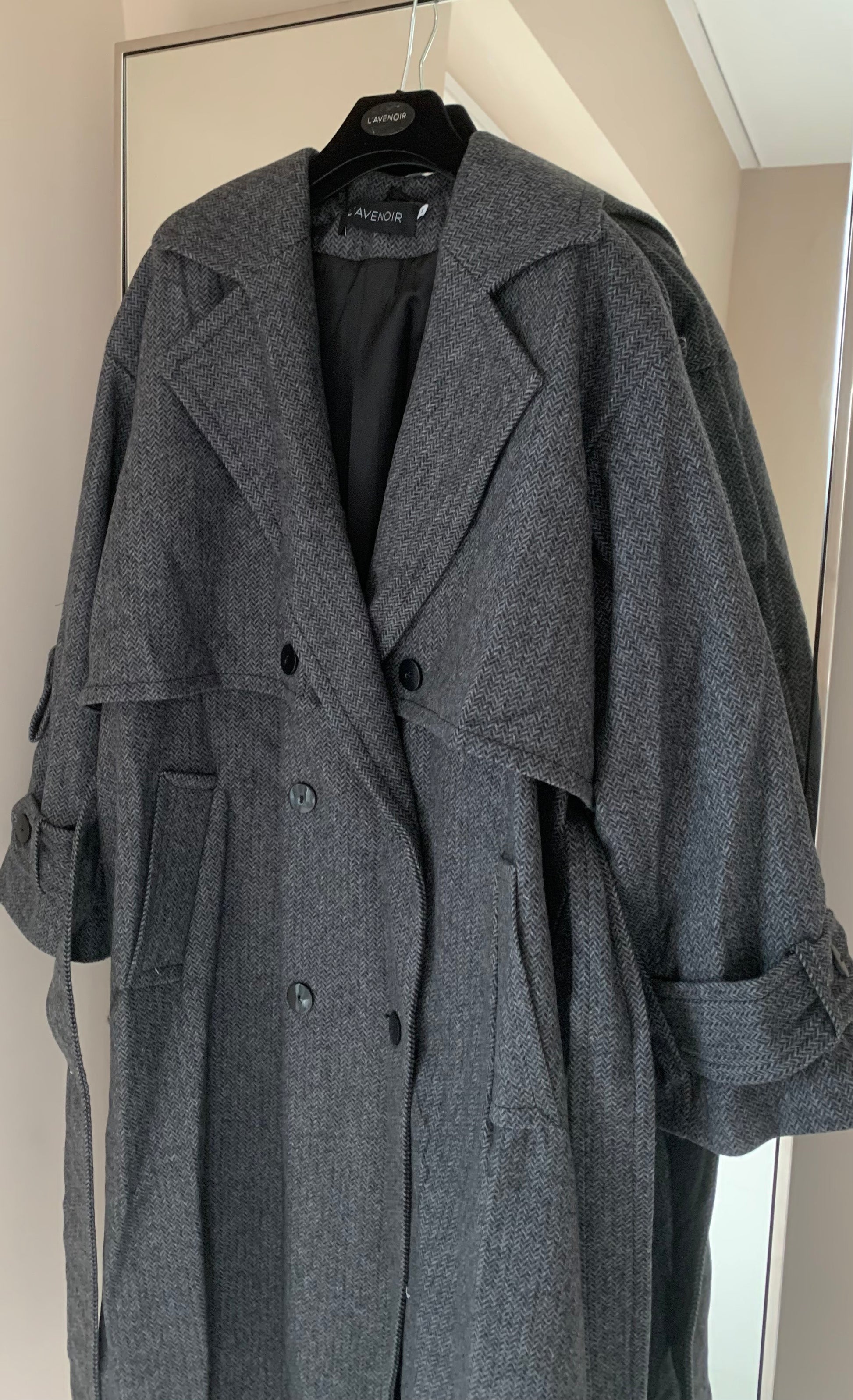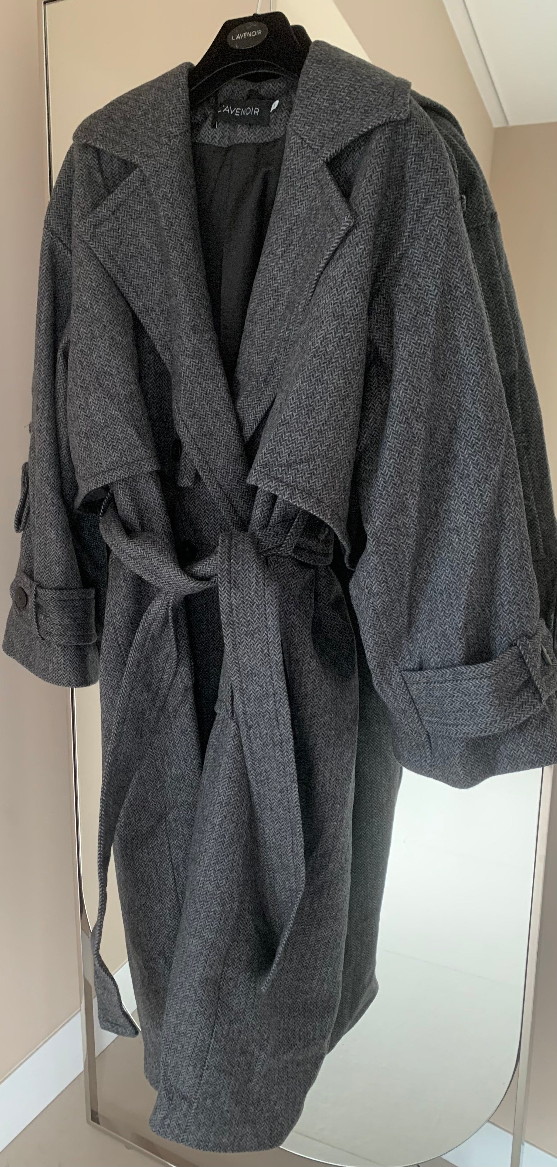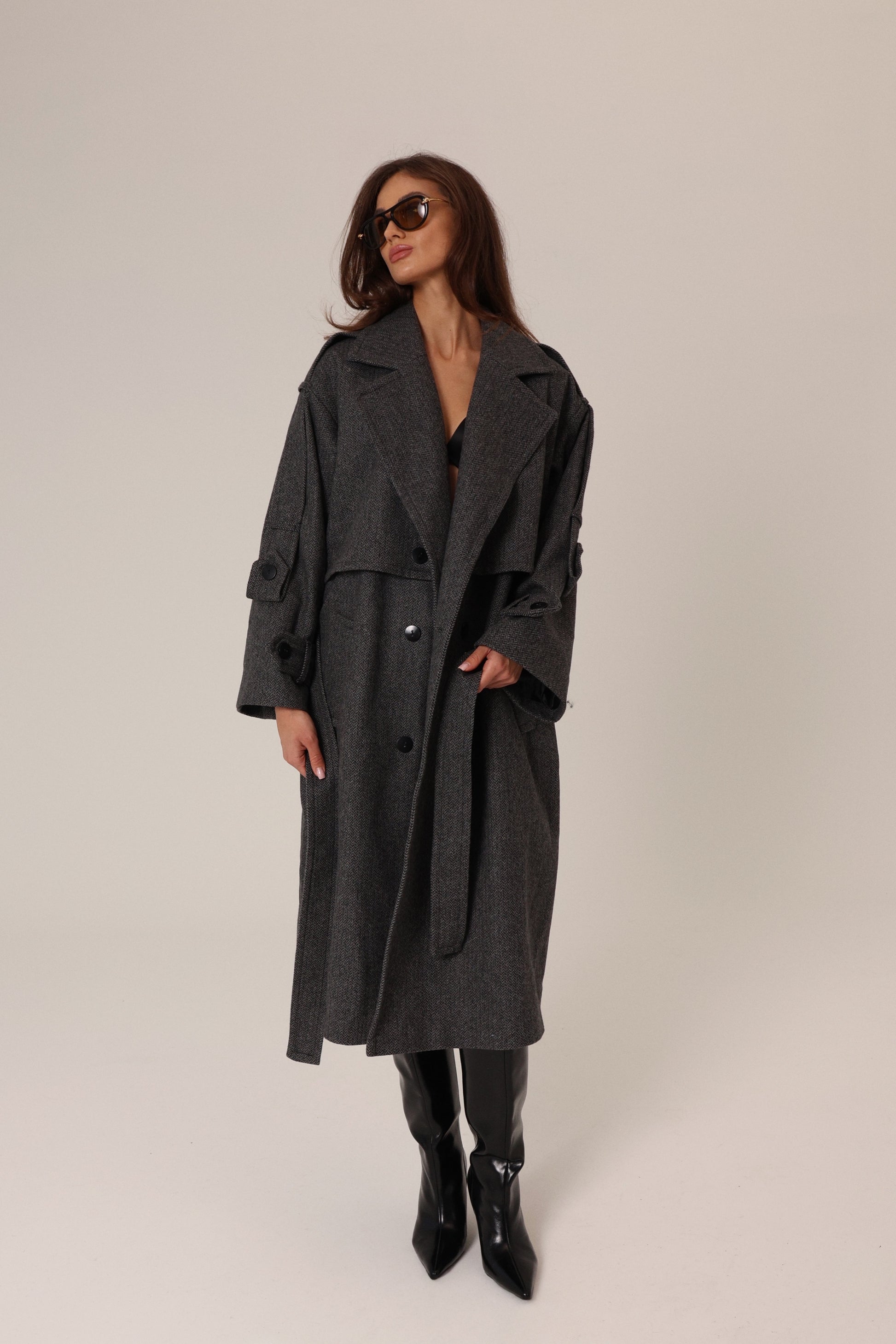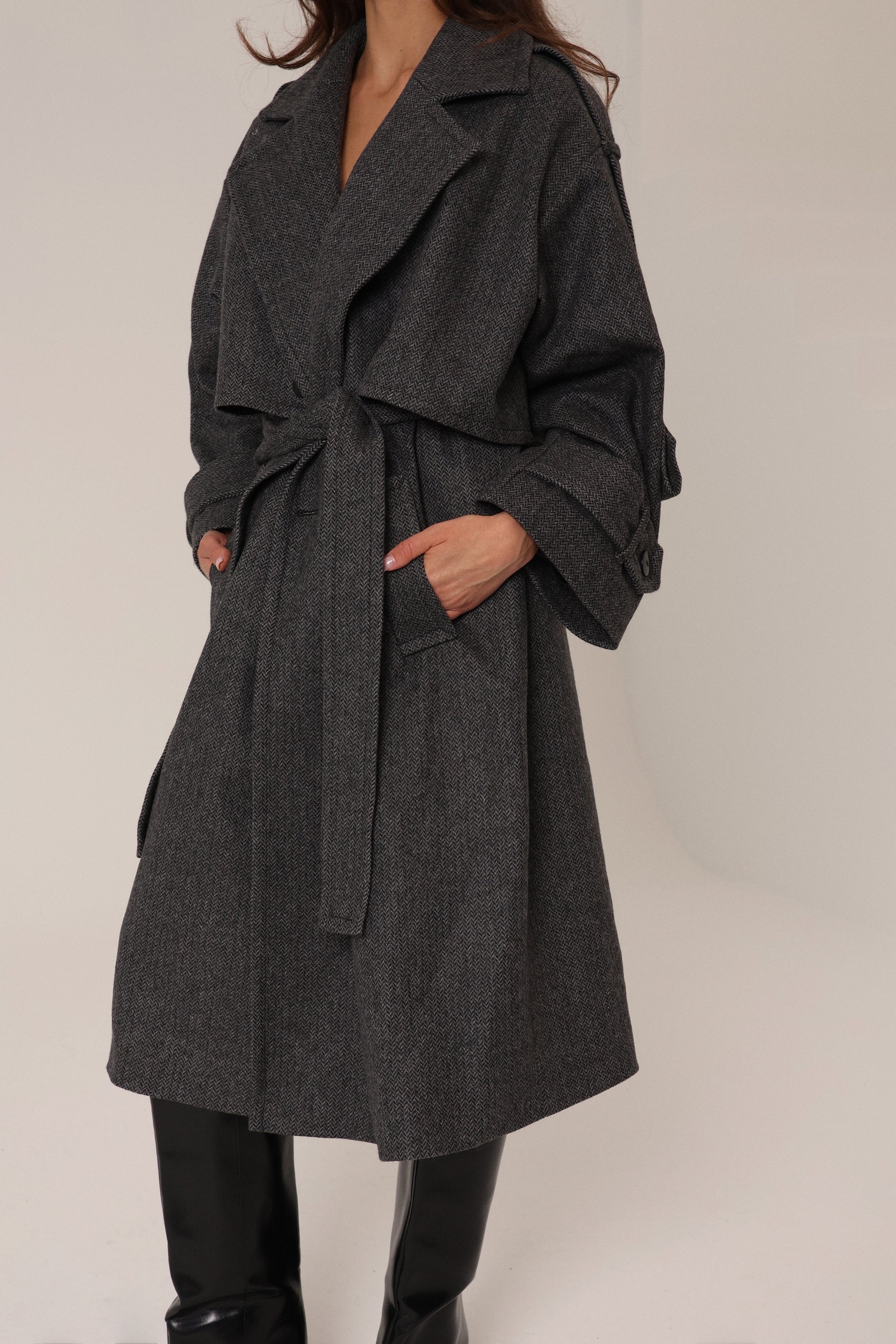 Wełniany trencz w jodełkę z kaszmirem. Odpowiedni na sezon jesień/zima
