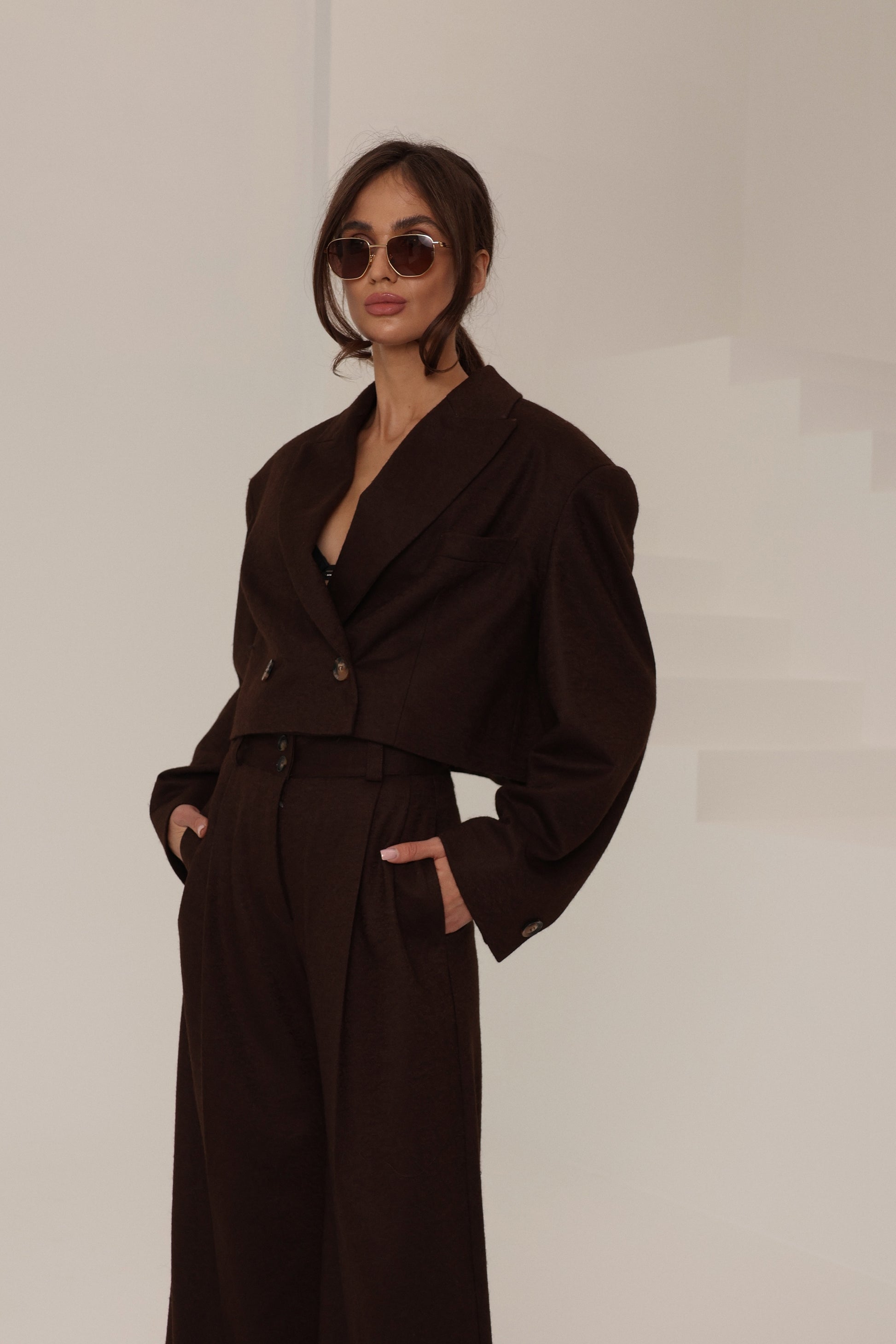 Marynarka oversize o krótszym kroju, szerokich ramionach z dużymi poduszkami.