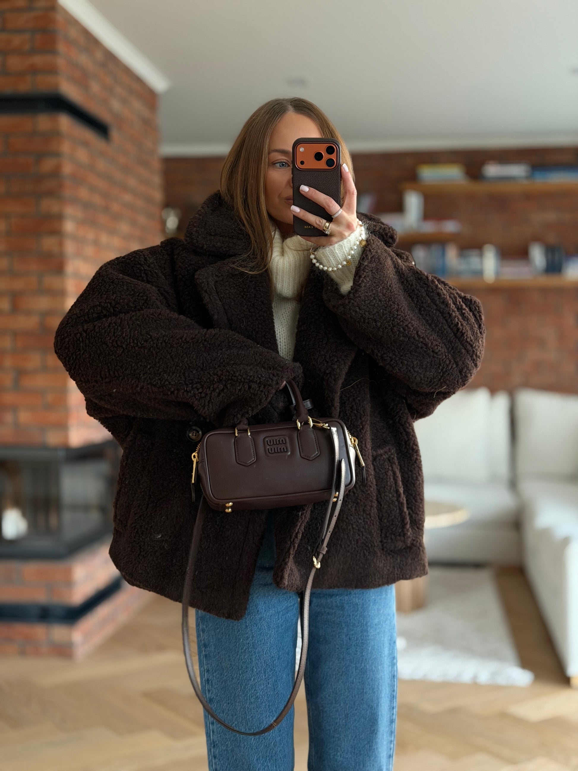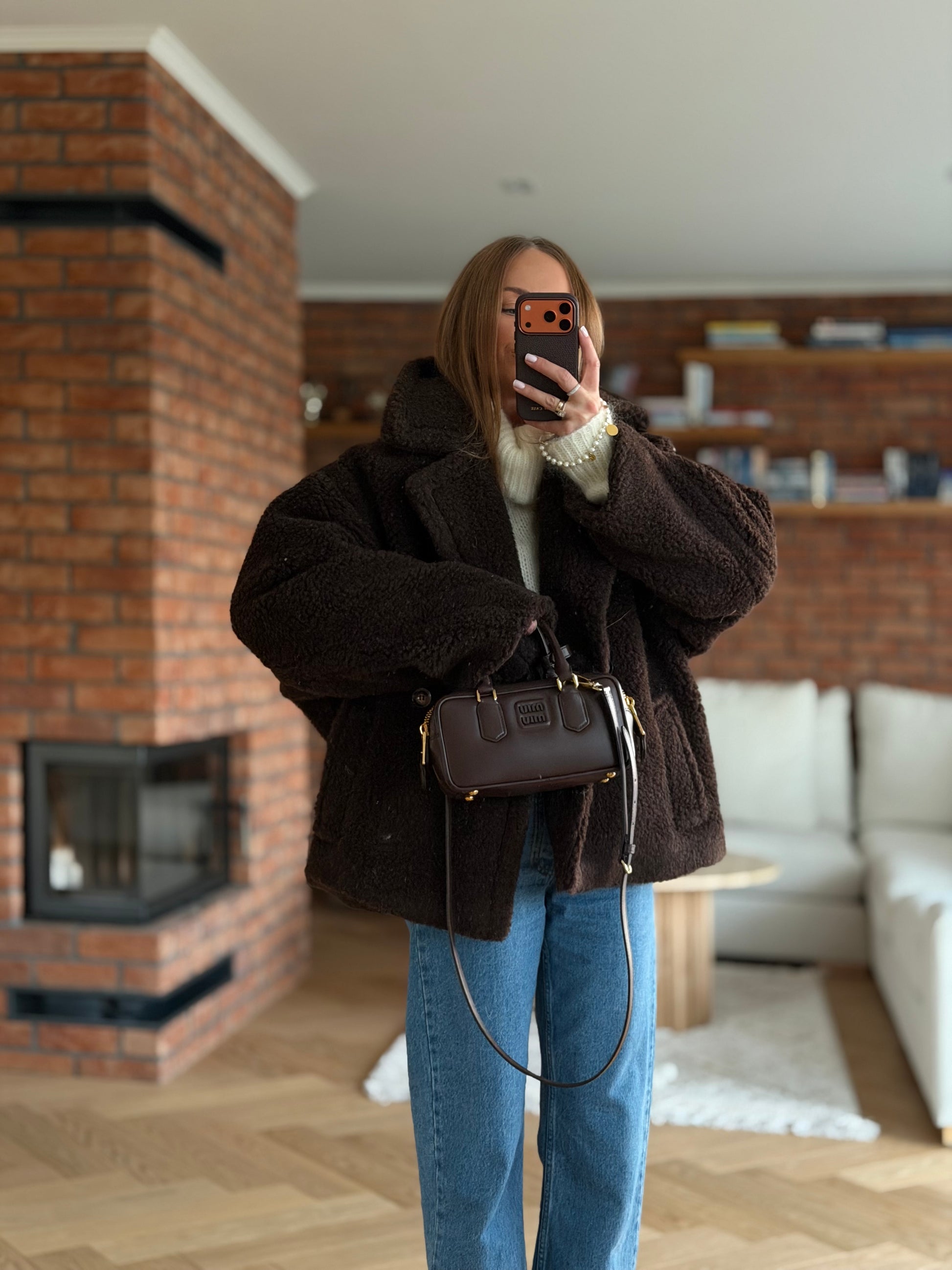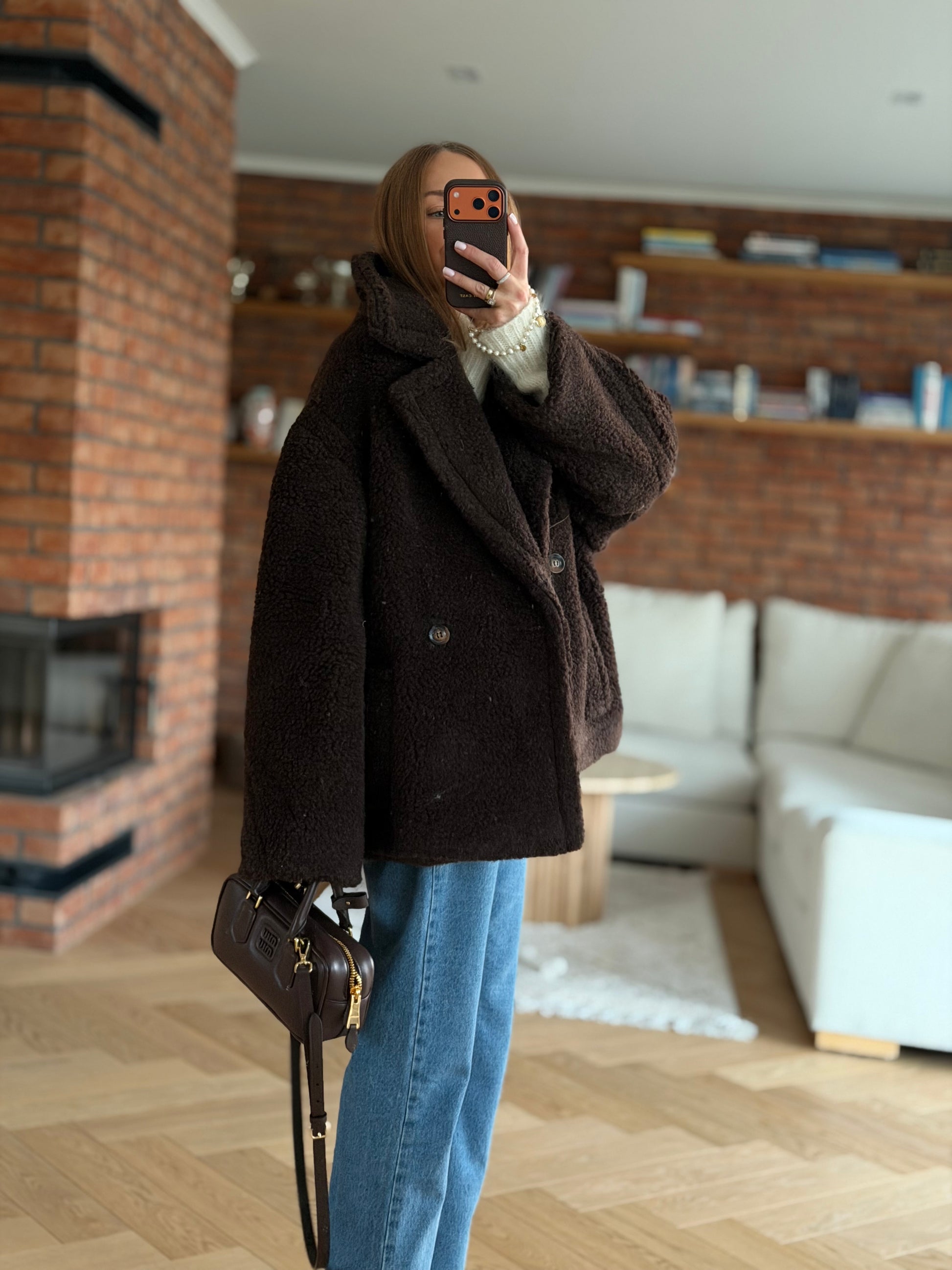 Wełniany kożuch, kurtka wykonana z wełny prawdziwego zdarzenia typu teddy- baranek w kolorze czekoladowym.