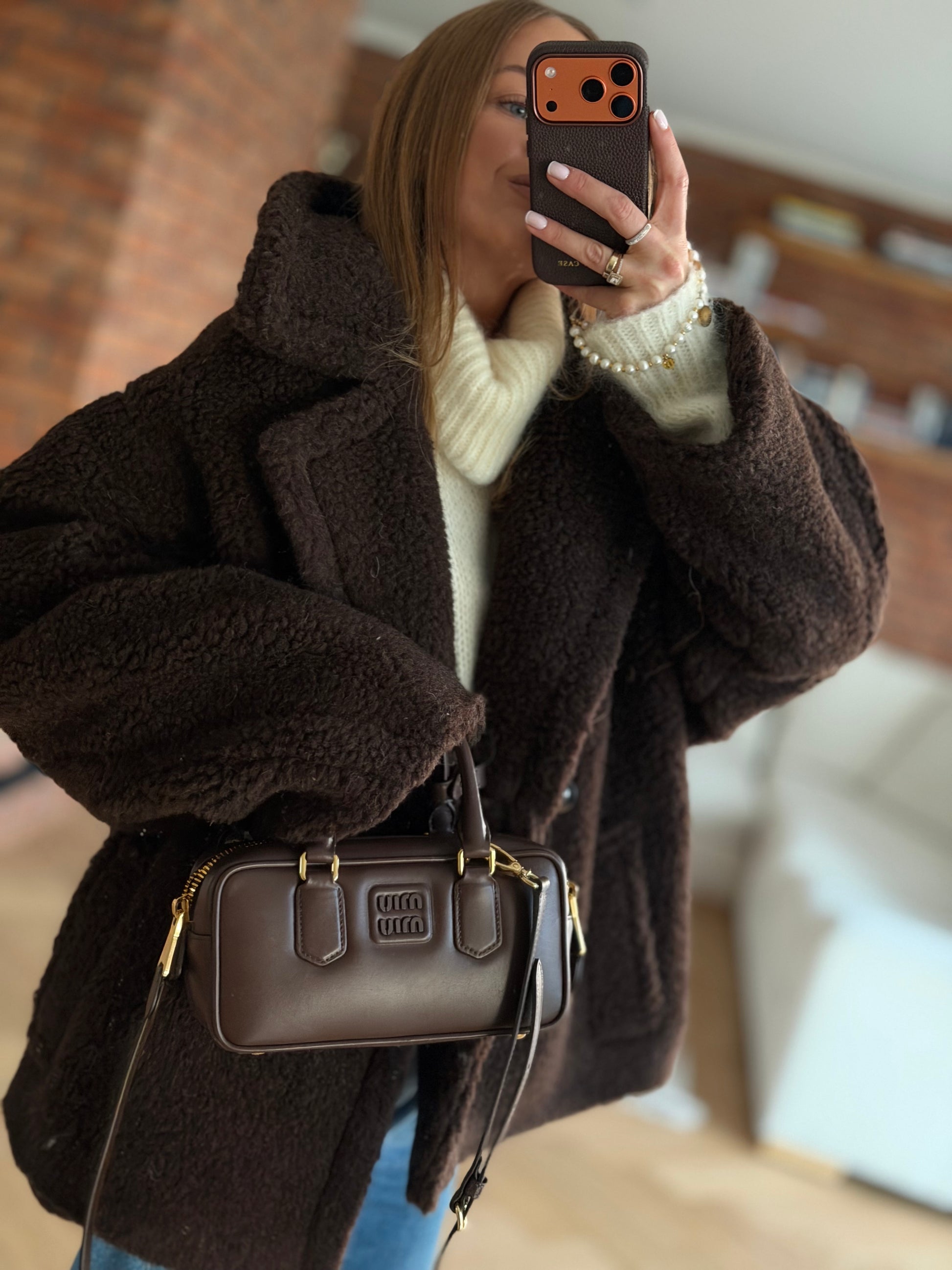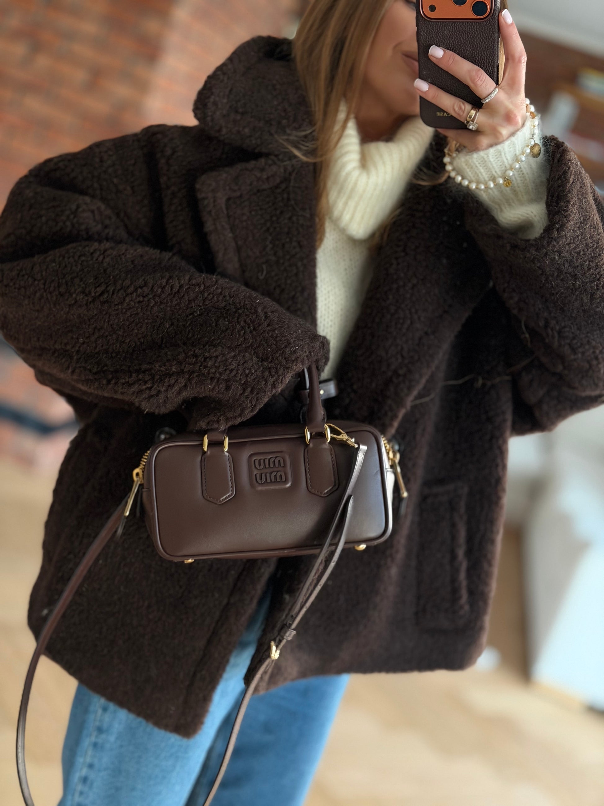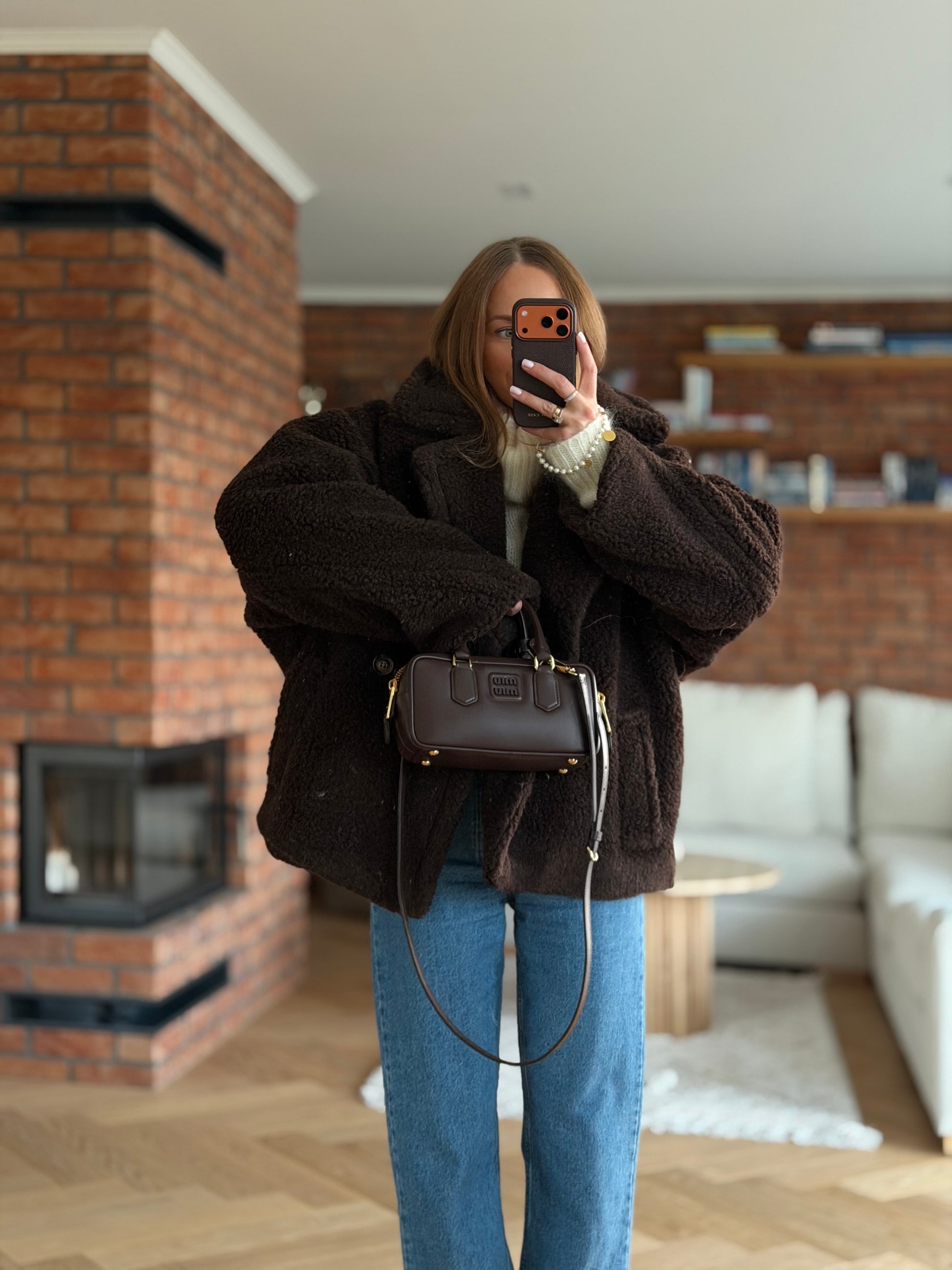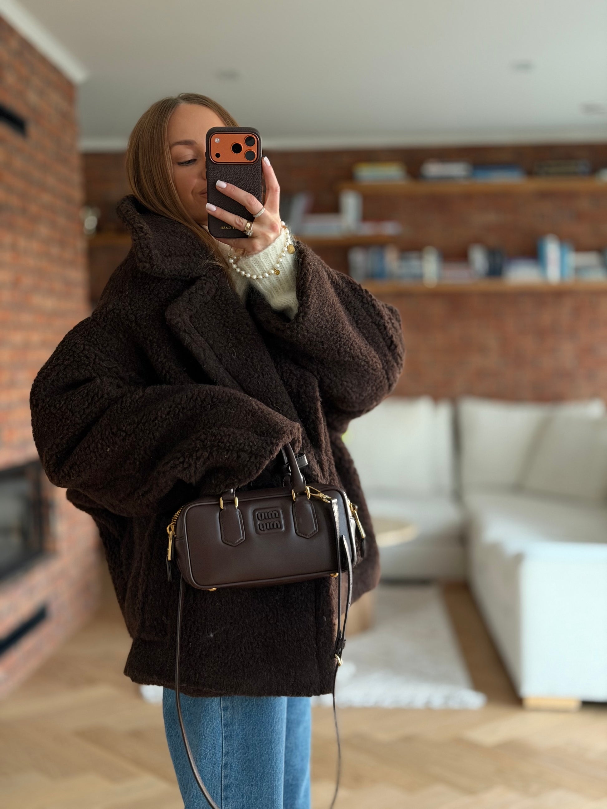 Wełniany kożuch, kurtka wykonana z wełny prawdziwego zdarzenia typu teddy- baranek w kolorze czekoladowym.
